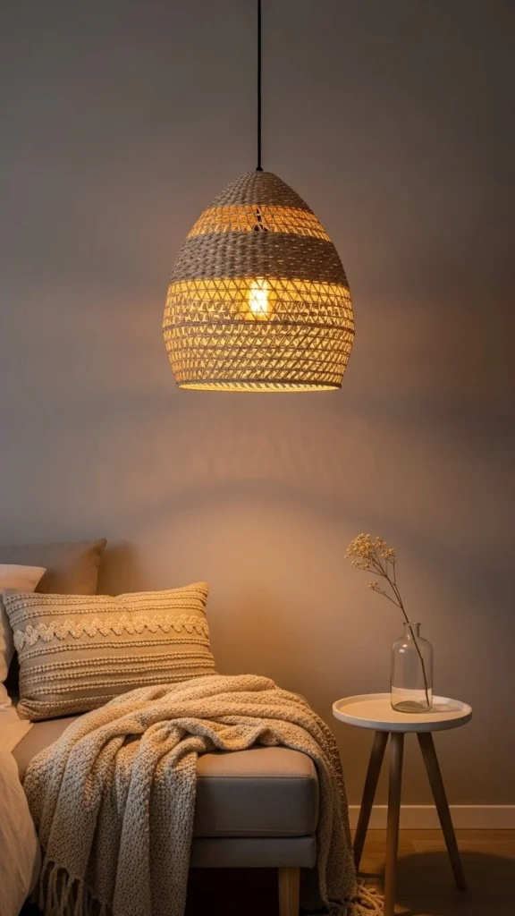 A pendant adds focused light without taking floor space. Choose woven or fabric shades for softness. Keep bulbs low wattage. Targeted lighting feels intimate. Install plug-in versions if hardwiring isn’t an option. This works well in bedrooms or reading corners.