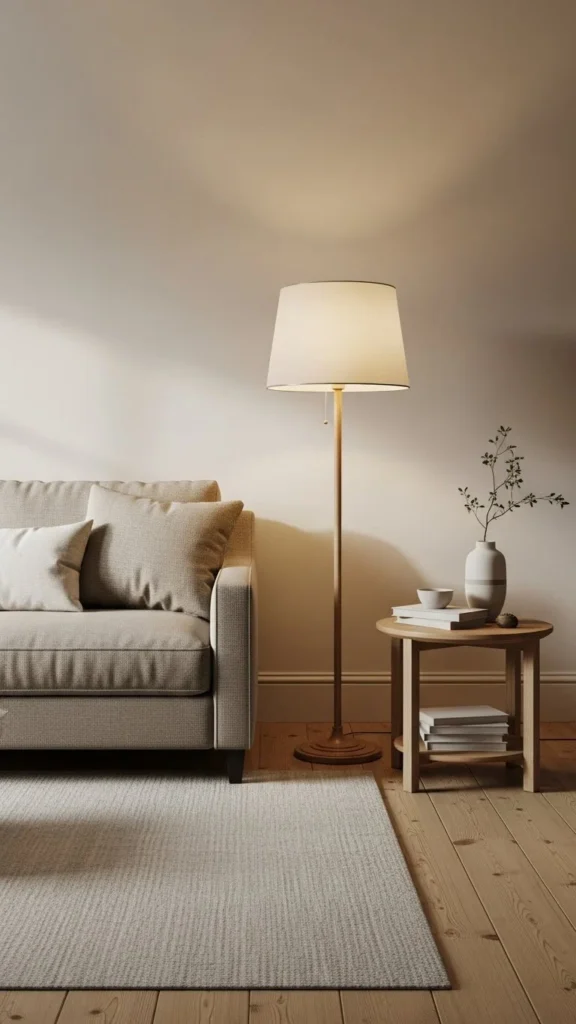 Floor lamps create layers. Place one behind seating rather than overhead. Fabric shades soften brightness. Low-level light sets calm energy. This option works year-round and suits many rooms.