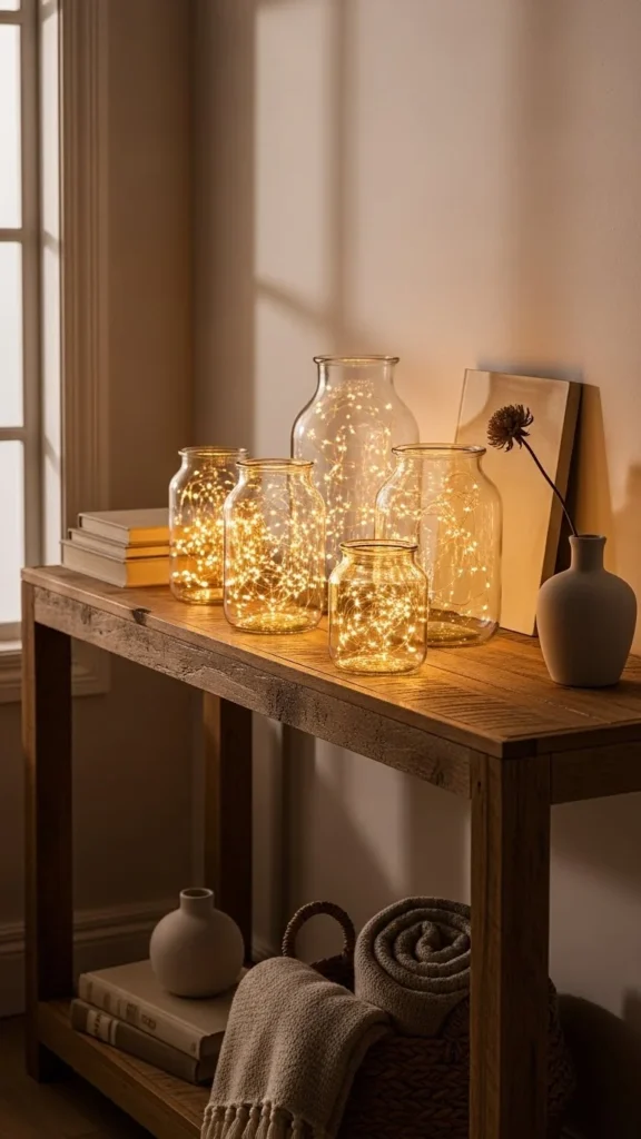 Glass jars turn simple lights into decor. Use clear or frosted jars. Keep cords hidden behind the table. DIY lighting feels personal and costs little. This setup suits shelves, mantels, or dining tables.
