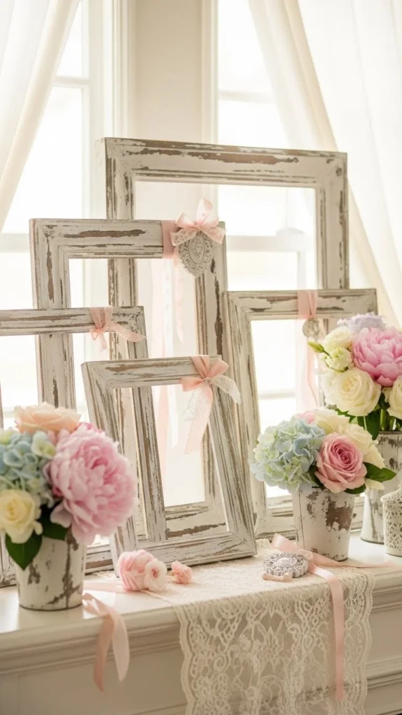 Distressed frames bring soft vintage romance to Valentine decor. Look for chipped paint or lightly sand new frames yourself. White works as a calm base for pink prints or handwritten notes. Keep photos minimal so the texture stands out. Lean frames instead of hanging for an easy setup. Mix frame sizes for charm. Thrift stores are gold for this look. Add small florals or candles between frames to break up straight lines. Stick to pale tones so nothing feels heavy. This style works well on mantels, shelves, or console tables.