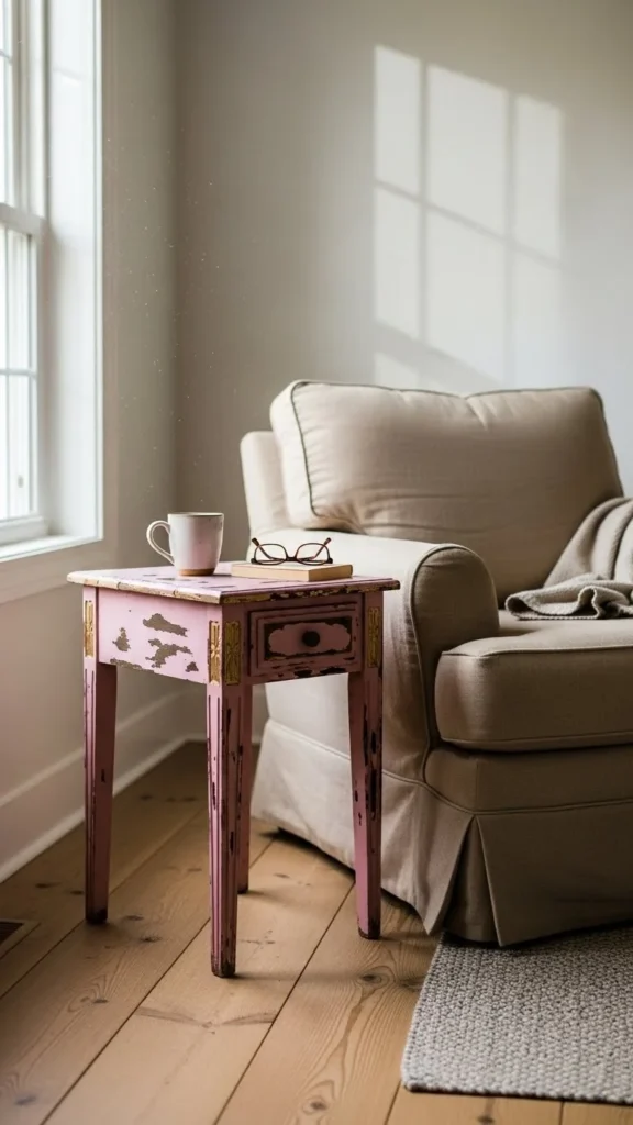 Paint old tables with chalk paint. Sand edges lightly. Style with books and florals. Soft color moments add interest.