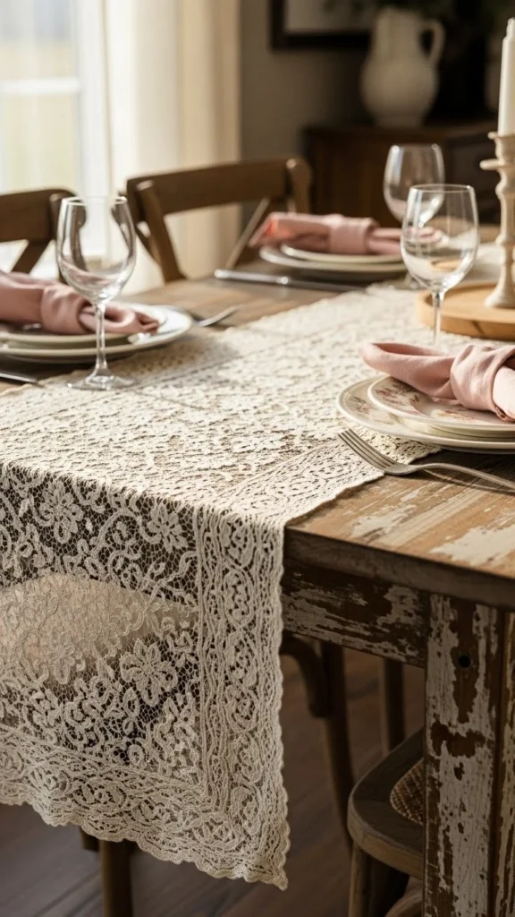 Lace runners feel timeless and romantic. Pair them with faded pink napkins or floral plates. If lace feels too delicate, layer it over linen for balance. DIY by trimming lace fabric and sealing edges. Keep centerpieces low to show detail. Layered textures bring depth without clutter.