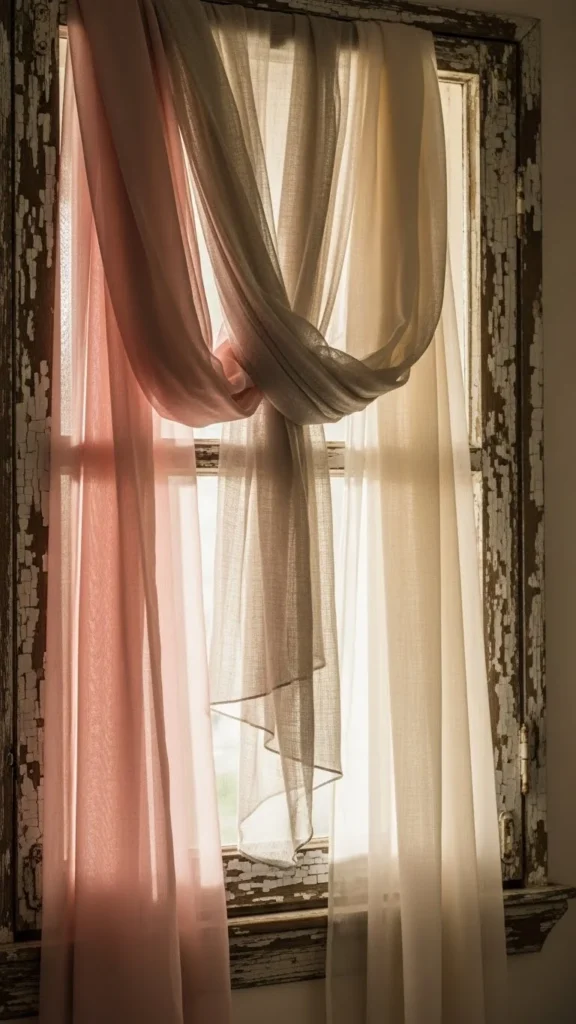 Window scarves add movement and softness without blocking light. Use lightweight cotton or gauze fabrics. Let edges fall naturally instead of cutting straight. Clip with small hooks or tie loosely at corners. Mixing blush with cream keeps the look gentle. Flowy fabric layers make windows feel dreamy and lived-in. This works well in kitchens, bedrooms, or breakfast nooks.