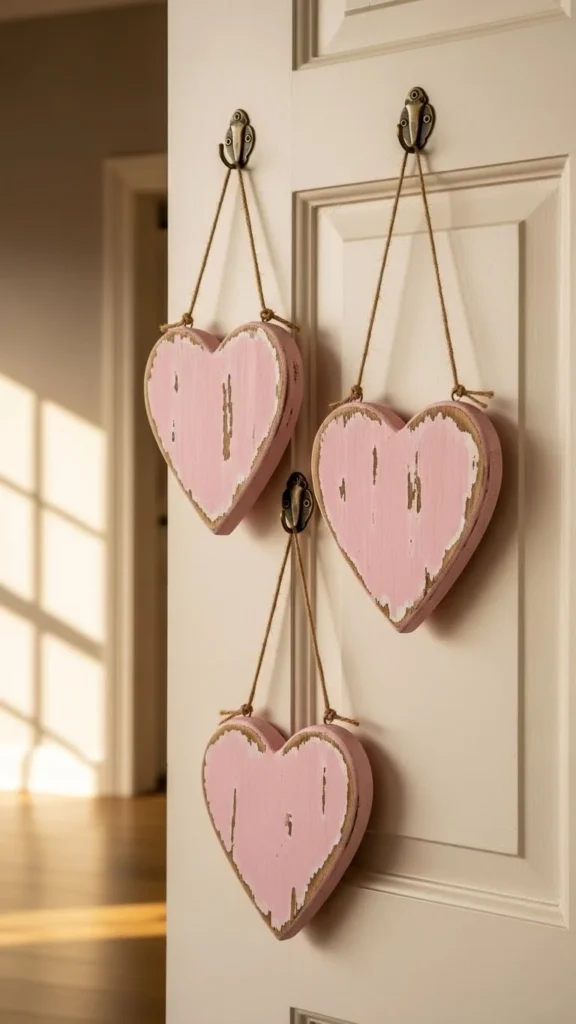 Wall hooks mix function with decor. Add heart charms using twine. Keep spacing uneven for character. Casual romance works in entryways.