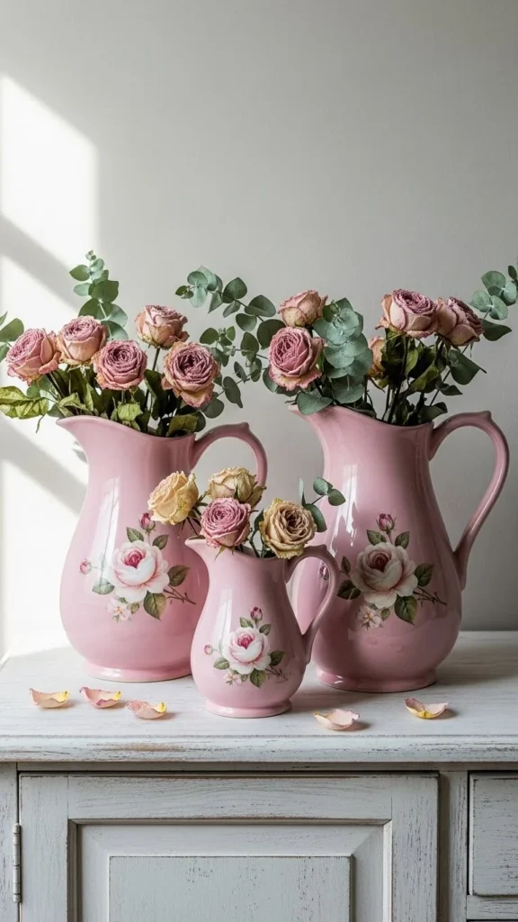 Floral pitchers work as vases or decor accents. Dried flowers last longer and feel relaxed. Group one large piece with smaller jars nearby. Chips and cracks add charm. Perfectly imperfect details shine here.