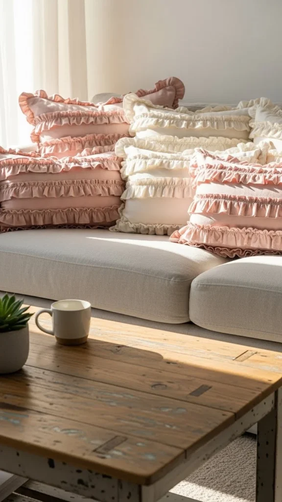 Ruffles add whimsy without being loud. Stick to cotton or linen fabrics. Limit patterns to avoid busyness. Swap pillow covers instead of buying new inserts. Gentle softness suits sofas and beds alike.