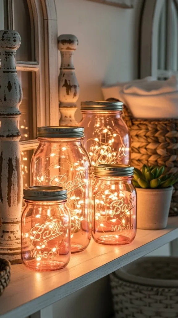 Tinted jars glow softly at night. Paint clear jars with glass paint if needed. Hide battery packs with twine. Cozy sparkle suits shelves and windows.