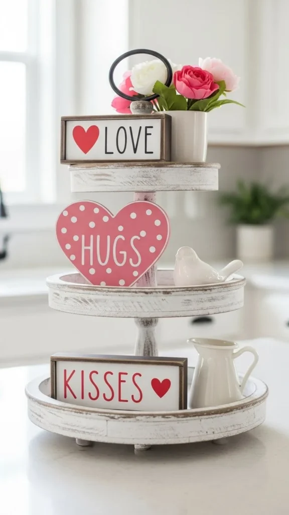 This look works well when you want instant Valentine energy without clutter. Use small wooden signs as the main visual anchor. Stack them vertically so each tier feels balanced. Stick to two main colors, like blush and cherry red, to keep the tray calm. Dollar-store signs work fine. Sand the edges slightly for a softer finish. If your tray is metal, add a folded linen napkin beneath the signs for contrast. Keep the top tier lighter so the whole setup doesn’t feel heavy. Swap wording signs for heart cutouts if you prefer symbols. This setup fits kitchens, coffee bars, or console tables.