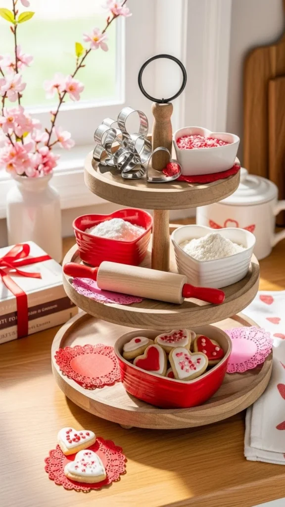 This idea blends decor with function. Hang cookie cutters from hooks. Use heart bowls for sprinkles. Keep metal pieces minimal so the tray stays warm. Perfect for family kitchens.