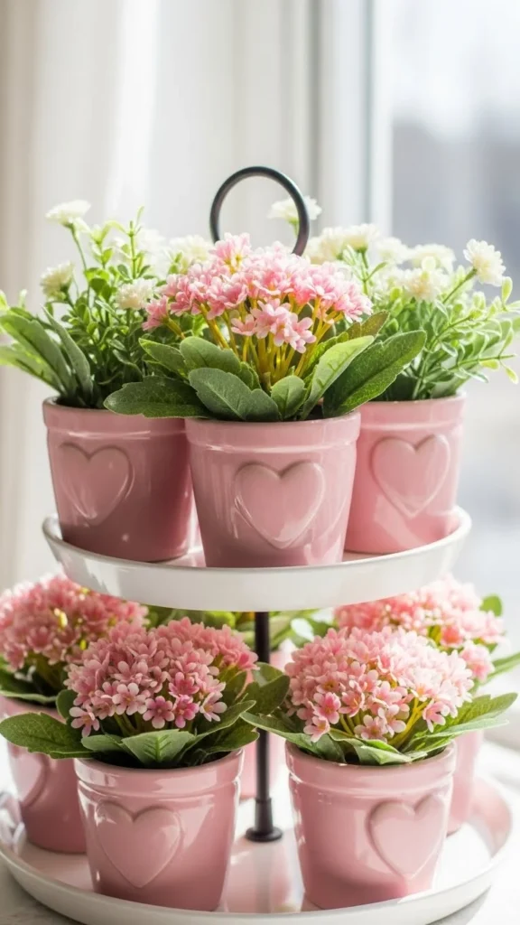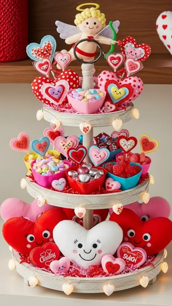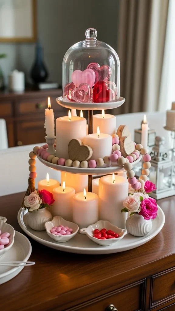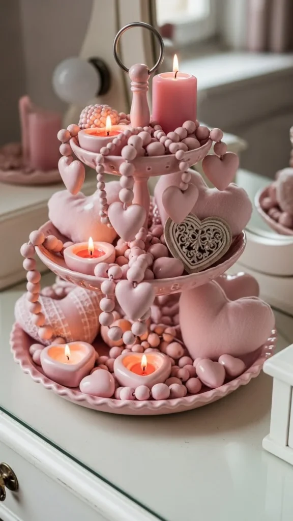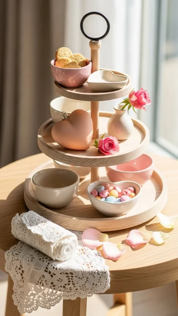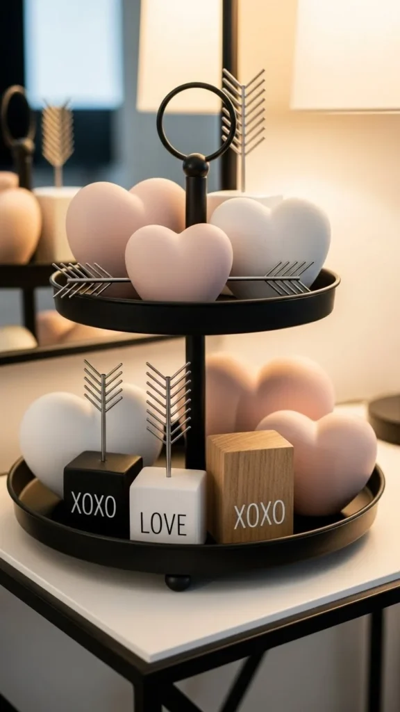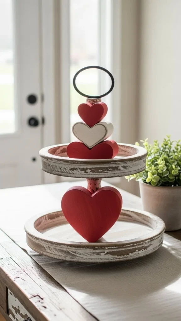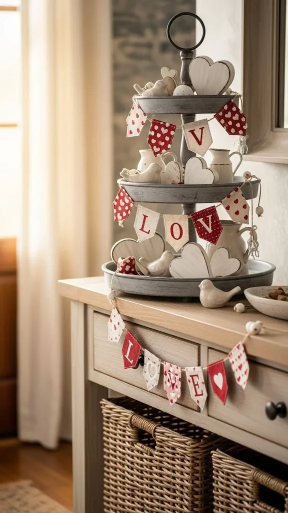Small banners add height without crowding the tray. Cut felt or cardstock into simple flag shapes. String them loosely so each tier still shows through. Stick to two soft colors so the look stays calm. You can write tiny words or leave them plain. This works well when your tray sits against a wall. Balance banners with solid items like wooden blocks or jars. If the tray feels busy, remove one banner and keep it only on the middle tier. This idea fits entry tables and hallway corners where you want gentle Valentine hints, not full color overload.