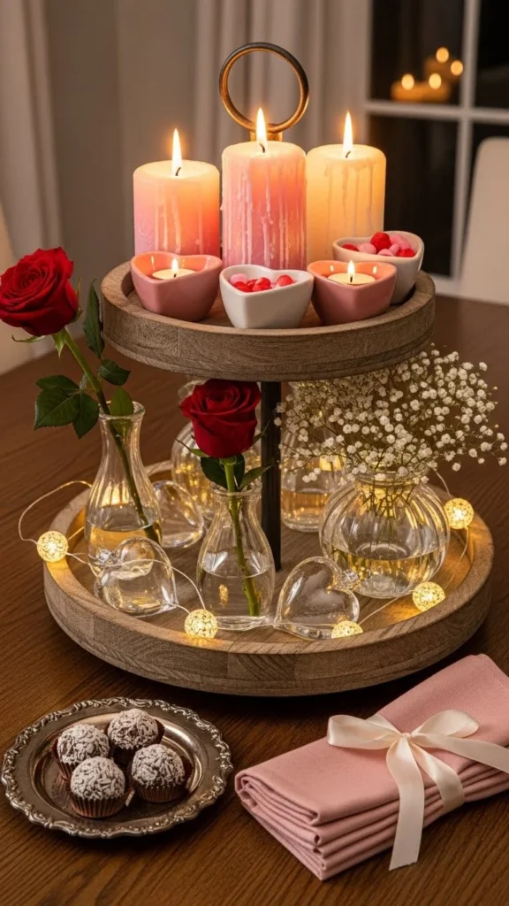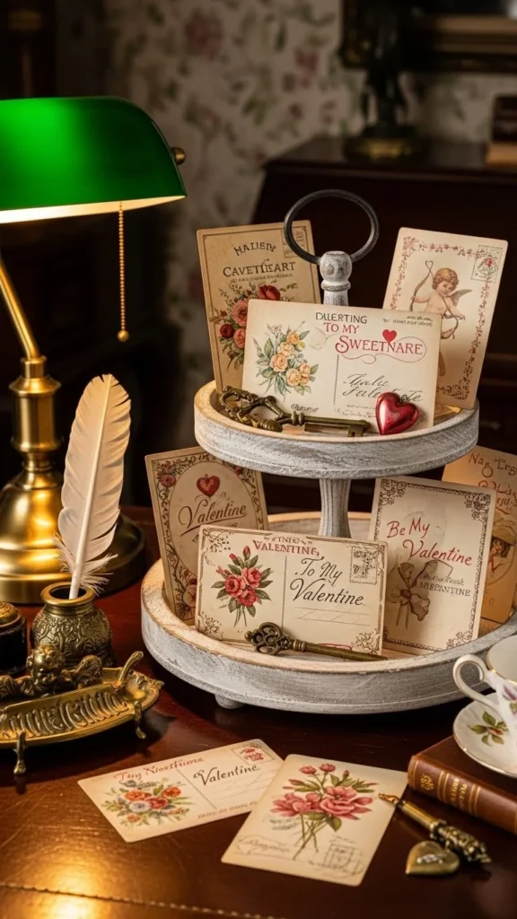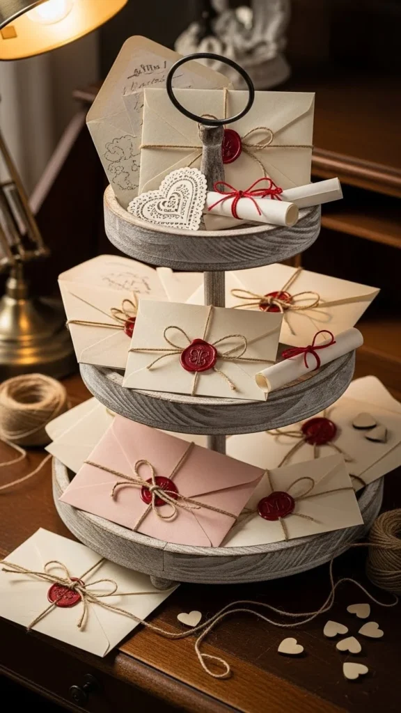 Love letters tell a story without bold decor. Use blank envelopes or aged paper for a gentle look. Tie bundles with twine for texture. Add one heart accent per tier to keep balance. This tray feels thoughtful and works well on desks or reading tables. It also stores easily after the season ends without extra packing.