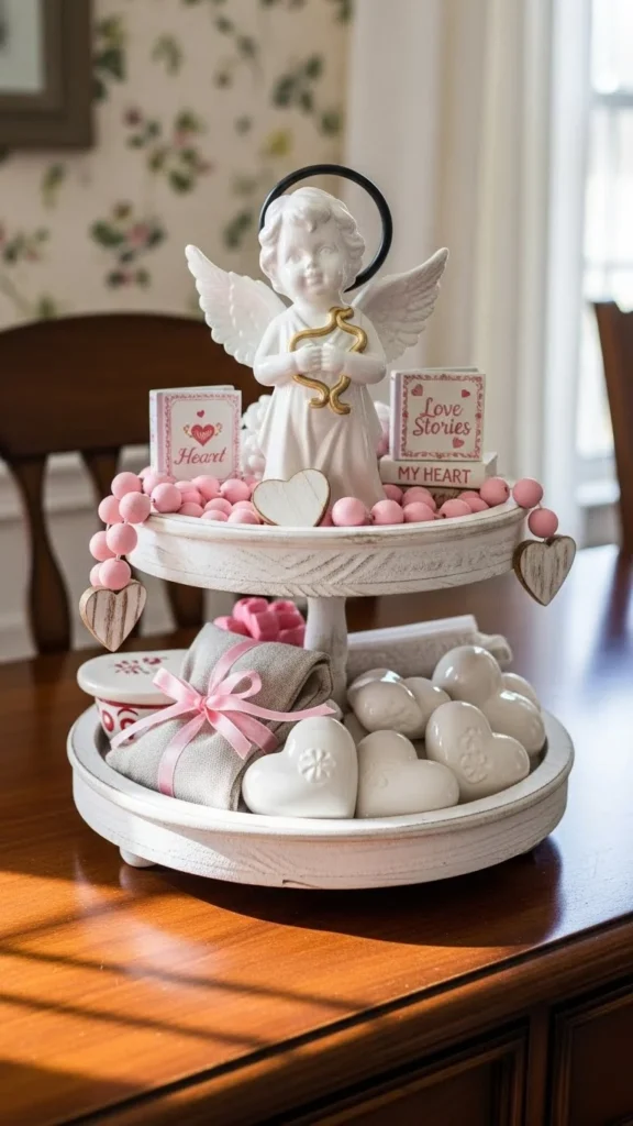A single figurine can guide the entire tray layout. Place the cupid slightly off-center for a relaxed feel. Surround it with soft textures like wood beads or fabric hearts. Neutral tones help the figure stand out. Thrift stores often carry angel or cupid statues that repaint easily. Use chalk paint for a smooth matte finish. Keep smaller items low so the figurine stays visible. This idea works best in dining areas or entry tables where eye level is higher.
