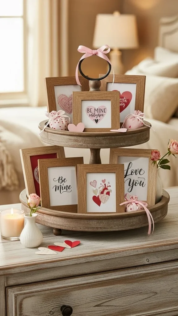 Mini frames add personality fast. Print simple heart art or short quotes. Use frames in the same finish so the tray stays organized. Lean frames slightly instead of standing them straight for a relaxed look. This idea works well in bedrooms or offices. Swap prints easily after February without changing the whole tray. Keep other items low so frames remain readable.