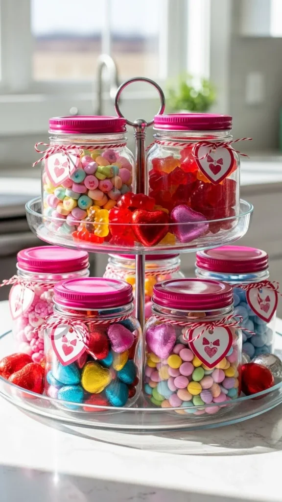 Candy jars add color and shine. Use different jar heights for interest. Keep labels simple to avoid visual noise. Fill with wrapped candies to avoid mess. This tray feels fun and works well for families. Rotate candy colors to match your space. Clear jars keep everything light and cheerful.