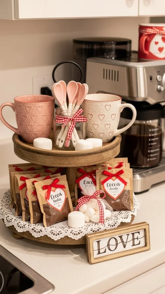 Mugs are practical and decorative. Choose one main mug per tier. Add cocoa packets or marshmallows for detail. This setup works well for shared spaces like kitchens. Keep handles facing outward for balance. Stick to two mug styles to avoid clutter.