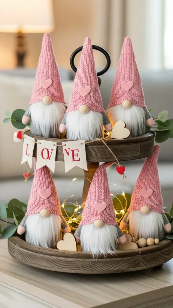 Gnomes add charm without feeling childish. Pick similar sizes so they feel intentional. Use wood blocks or books to adjust height. Keep background items simple so the gnomes stay playful, not busy.