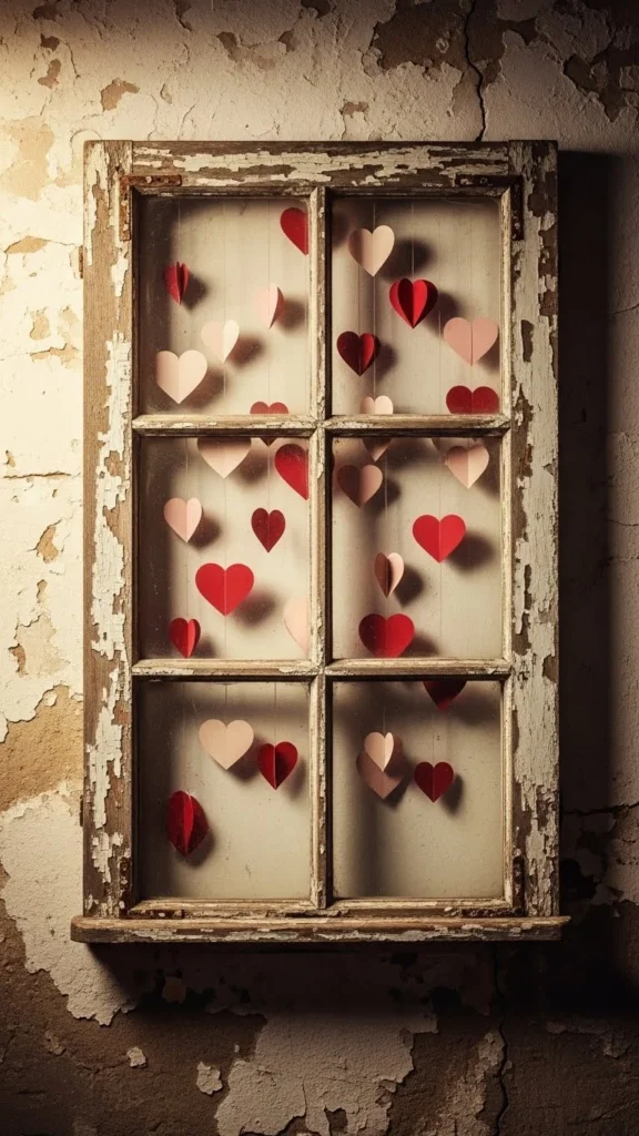 Old window frames add character. Hang paper hearts behind glass openings. Paint lightly if needed. Architectural nostalgia accents suit living rooms and entryways.