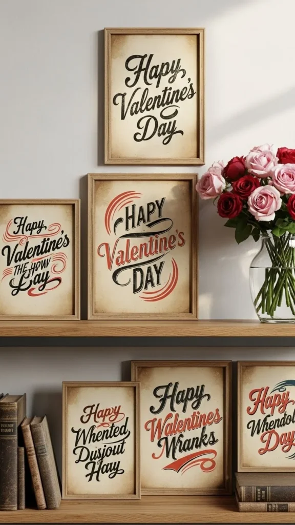 Old Valentine postcards carry a charm you can’t fake. Look for soft reds, pinks, and cream paper tones. Slightly yellowed edges add character. Frame them loosely so they don’t feel stiff. Thrift shops and flea markets are goldmines. Printable replicas also work if originals feel pricey. Nostalgic paper details shine best when paired with simple frames. Hang them in a loose grid or casual row. Hallways and stair walls are perfect spots. Keep nearby decor minimal so the artwork tells the story. Even three or four cards can create a meaningful display.