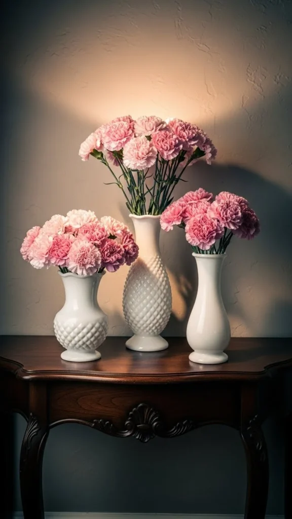 Milk glass feels soft and timeless. Pair with pastel flowers. Use varied shapes. Quiet vintage elegance suits mantels and consoles.