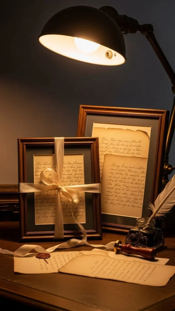 Handwritten notes feel personal. Frame copies of letters or poems. Use tea-stained paper for effect. Sentimental paper styling works well in bedrooms.