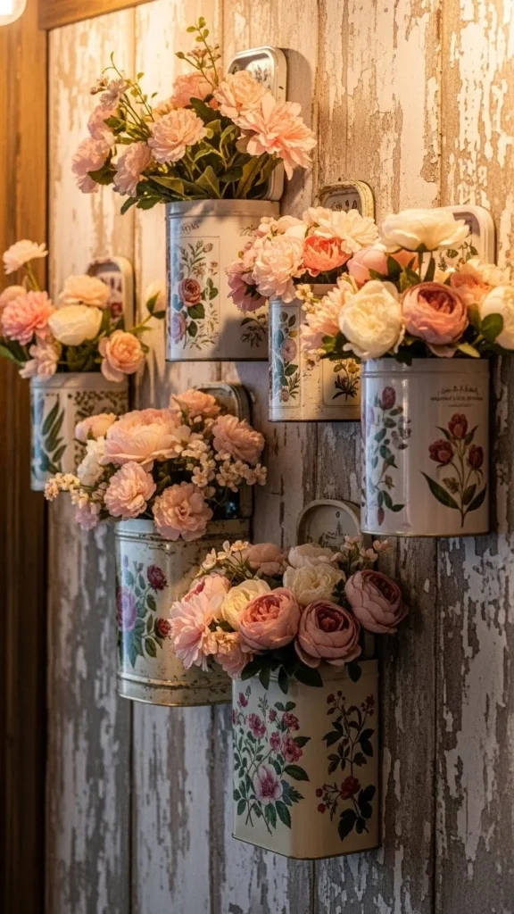 Floral tins feel cheerful. Hang in rows or clusters. DIY by distressing new tins. Wall-mounted vintage accents save space and add charm.