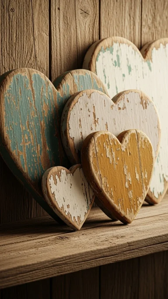 Wood hearts feel handmade. Sand edges lightly. Use soft paint colors. Rustic love symbols suit farmhouse spaces.