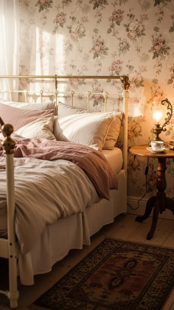 Floral wallpaper brings instant throwback charm. Use it as an accent wall or behind shelves. Peel-and-stick versions are renter-friendly. Choose small-scale florals for balance. Old-fashioned pattern charm pairs beautifully with iron beds and lace accents. Keep bedding simple so the wallpaper stands out gently.