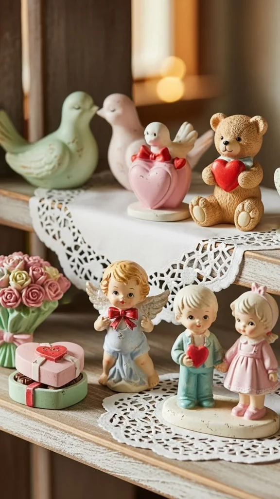 Figurines add playful nostalgia. Look for cupids or heart motifs. Minor wear adds character. Group them loosely. Collected keepsake styling works well on shelves and mantels. Avoid crowding so each piece feels special.