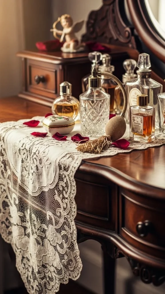Lace on a vanity feels timeless. Layer runners or doilies lightly. Add perfume bottles for sparkle. Soft romantic corners create a gentle Valentine mood. Everything can be cleared away easily when the season passes.