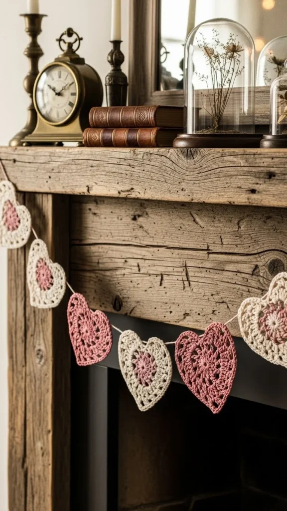 Crochet hearts feel handmade and timeless. Soft yarn tones work best. Make your own using simple patterns. Handcrafted warmth details suit mantels, shelves, or headboards. Space hearts evenly so the garland drapes naturally.
