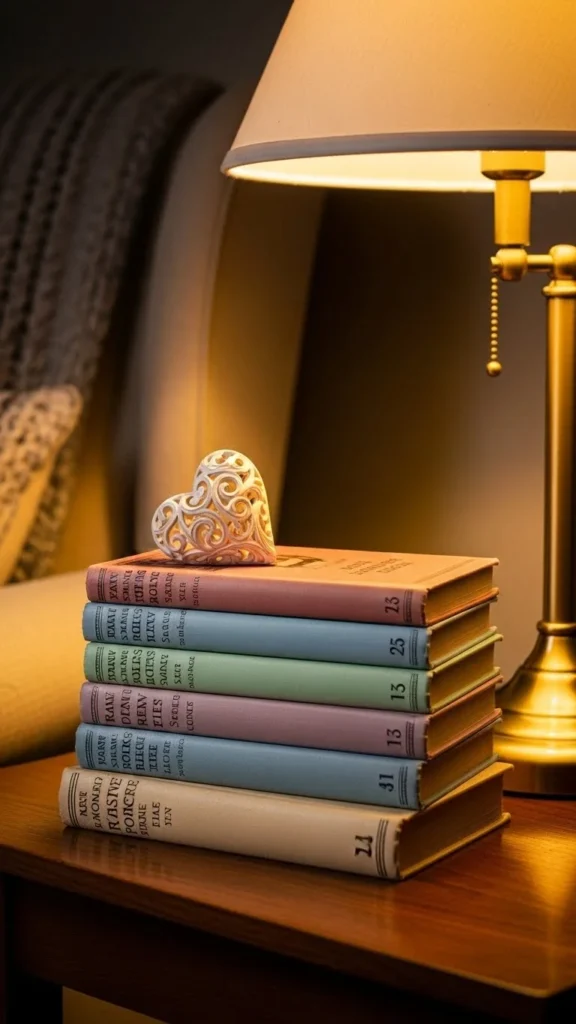 Old books tell stories even when closed. Look for faded covers and serif fonts. Stack by size. Add a small Valentine accent on top. Literary nostalgia styling works well in living rooms and bedrooms.