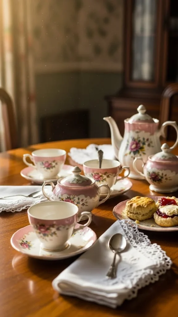 Old tea sets feel romantic and gentle. Use them as decor or functional pieces. Mismatched cups add charm. Tea-time nostalgia scenes work beautifully on hutches or tables.