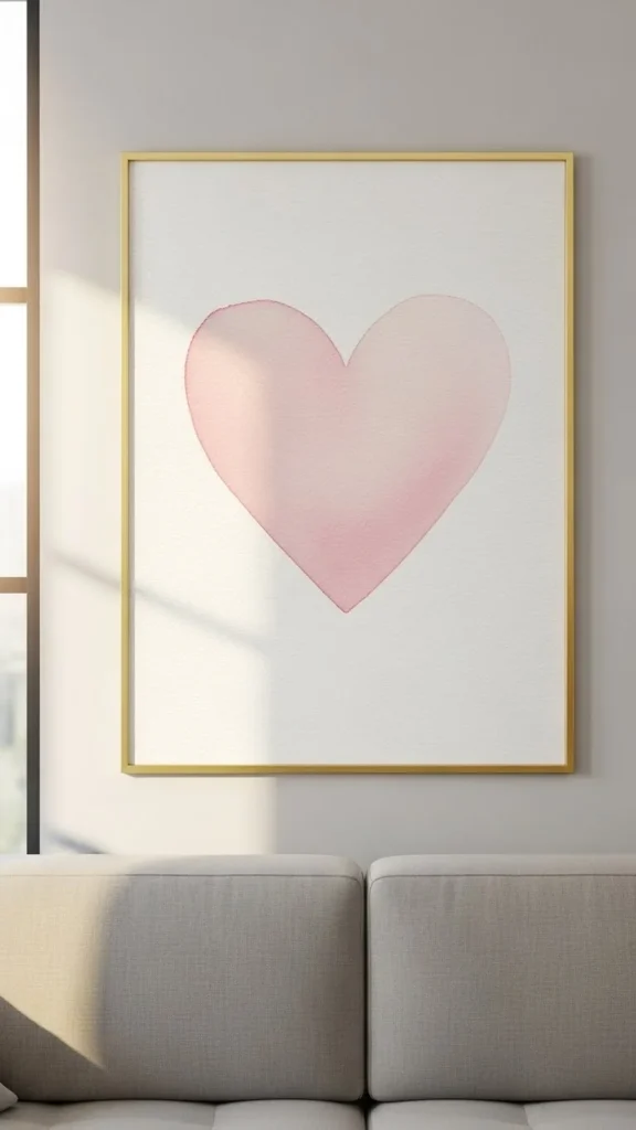 A simple blush watercolor heart feels calm and chic at the same time. Its softness blends well with almost any décor. Print a high-resolution file at home or paint your own using watercolor paper and diluted pinks. Keep the frame slim so the artwork stays delicate. This piece works in living rooms, bedrooms, and entryways. Pair it with other soft-toned pieces for a mini gallery effect. Add a gold frame for a subtle touch of shine that balances the gentle colors.