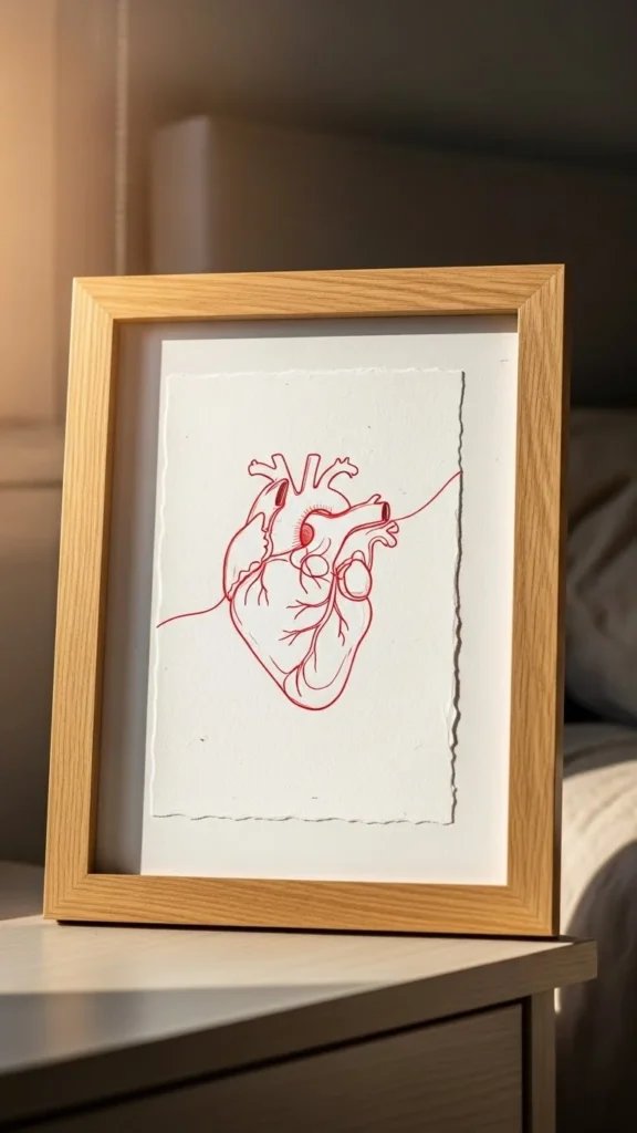 Minimalist red ink art feels crisp and stylish. It adds Valentine color without overpowering the wall. Use textured paper for an organic look. Draw a freehand heart with soft, uneven lines to keep it artistic. A natural wood frame adds warmth. You can build a small grouping with other simple sketches for added charm. This piece works well in minimalist or Scandinavian-inspired interiors.