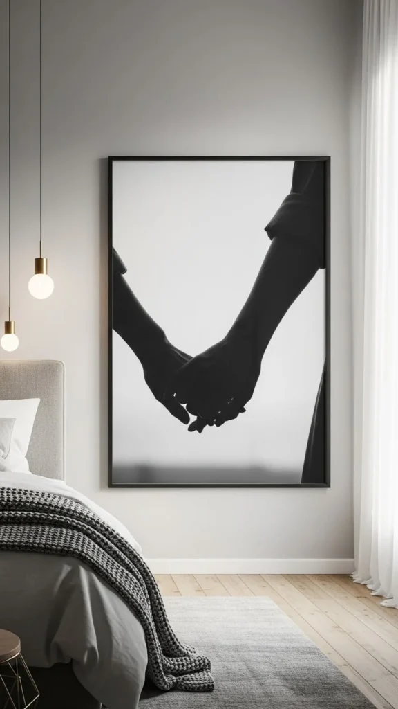 Monochrome prints deliver drama while staying chic. A couples-themed silhouette fits perfectly into Valentine decorating. Choose a photo with soft outlines and high contrast. Print it on matte paper for sophistication. Keep the frame simple so the subject takes center stage. Hang it beside typography art or minimalist sketches for a cohesive set. This style adds emotion while staying clean and modern.