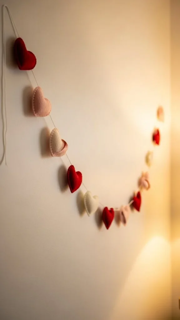 A felt heart garland brings a playful, cozy feel to the room. Hang it above a sofa, across a bookshelf, or over a doorway. You can sew or glue the hearts onto string using craft felt. Choose soft hues for a gentle look or bold colors for contrast. This is a great project for beginners because the shapes are simple. Garlands also store easily, making them a reusable décor option.