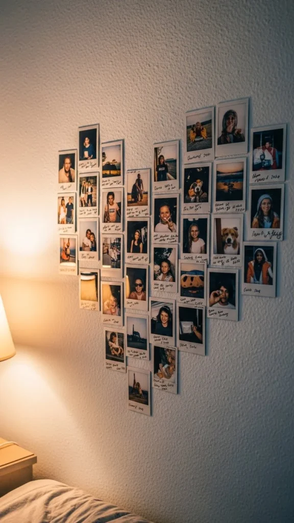This collage creates a personal Valentine display. Arrange small photos into a heart shape using removable adhesive tabs. Choose moments that bring joy—celebrations, trips, or everyday snaps. Keep colors cohesive by adding a soft filter before printing. This layout works well above desks or nightstands. If you want more structure, outline the heart with faint pencil marks before sticking the photos. It’s a simple way to add meaningful décor without spending much.