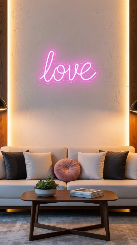 A neon light adds a fun, stylish twist to Valentine wall décor. Choose soft pink or warm white for a gentle glow. Mount it above a sofa, near a bar cart, or above a nightstand. Neon signs are lightweight and easy to hang. If you’re on a budget, LED faux-neon strips are a great alternative. Keep nearby décor simple so the glow becomes the star moment in the room.