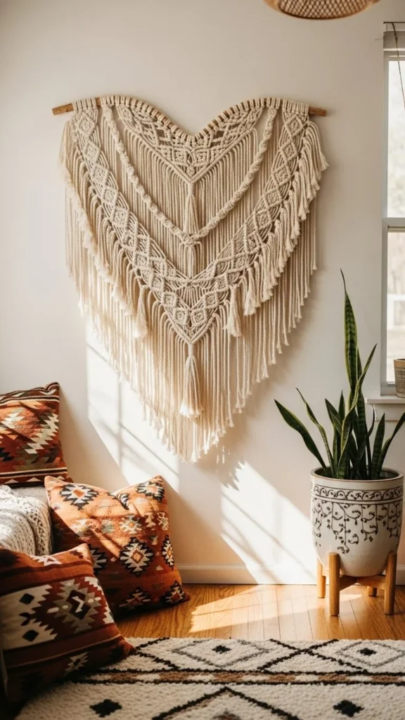 Macramé adds softness and texture to walls. Craft a heart-shaped piece using basic knotting patterns. Choose ivory or blush cord for a romantic feel. This artwork brings warmth to boho or minimalist spaces. Hang it using a wooden dowel or metal rod. For variation, add tassels or small beads to the lower fringe. Macramé pieces are simple to customize and make beautiful DIY décor.