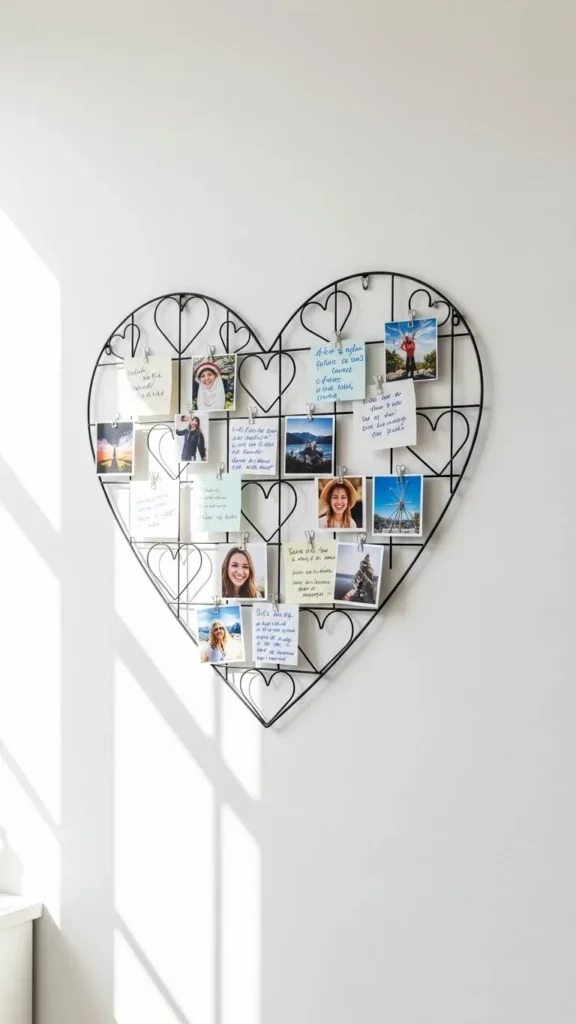 Geometric grids offer function and charm. This heart-shaped version can display photos, cards, or tiny art prints. The metal frame adds a modern touch. Hang it in a workspace, hallway, or teen bedroom. Use clips or mini clothespins to update the display anytime. Spray-paint the frame gold or blush if you want softer tones. It’s practical décor that also adds shape and personality to your walls.