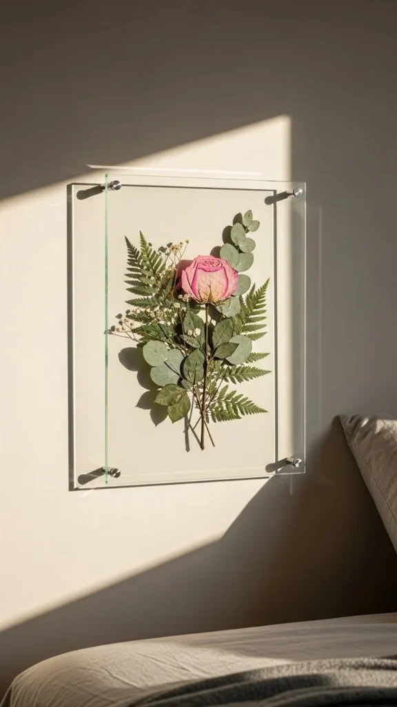 Pressed florals create calm, romantic art that feels timeless. Choose a rose with soft petals, press it between heavy books for a week, then mount it inside a floating frame so the details stay visible. This style works well in bedrooms or reading corners. Use two or three frames in a vertical row for a refined composition. The transparency keeps the art light and airy. Press petals from special occasions to make the piece even more meaningful. This is an easy project that adds gentle Valentine charm without overwhelming the space.