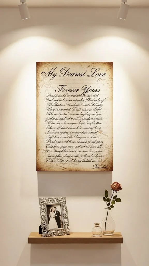 Love letter art adds emotion and warmth to any room. Use printed handwriting or write your own message for a personal touch. A neutral canvas keeps the piece soft and elegant. Choose sepia or charcoal ink tones to mimic vintage notes. Hang the canvas above consoles or sofas for a calm focal point. If you want a DIY project, lightly brush the canvas with diluted beige paint for an aged background. This idea feels sentimental while still looking clean and modern.