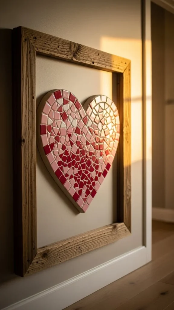 Mosaic art introduces color and texture in a unique way. Use leftover ceramic pieces, broken plates, or craft tiles. Arrange them into a heart shape and glue them onto a sturdy backing. Add grout for that classic mosaic finish. The rustic wood frame creates depth and warmth. This piece works beautifully in hallways or entryways. The color variations bring a lively Valentine touch while still feeling artistic and handmade.