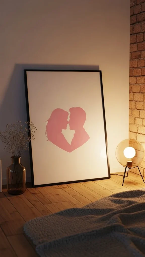 Silhouettes feel artistic and intimate. Choose a simple outline with calm shapes and soft tones. Matte paper adds texture and makes the colors appear gentle. Black metal frames contrast beautifully against pink tones. Hang it beside typography pieces or floral prints for balance. You can DIY by snapping a side-profile photo and tracing the outline digitally. This style fits both modern and classic Valentine decorating approaches.