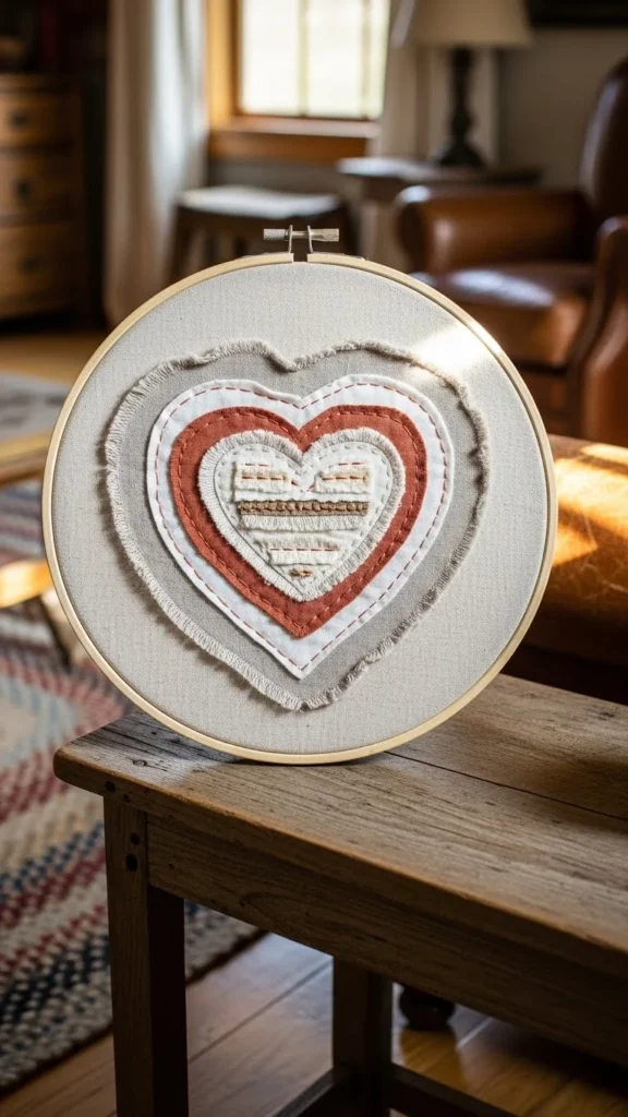 Fabric art brings texture and warmth to your wall. Use leftover fabric scraps in soft Valentine tones—linen, cotton, or muslin. Cut and layer them into a heart shape, then stitch or glue them onto a backing fabric. Display the piece in an embroidery hoop or wooden frame. This adds a cozy handcrafted feel to your room. Combine two or three fabric hearts in different sizes for a simple gallery grouping. It’s a low-cost, charming décor idea with a soft, tactile effect.