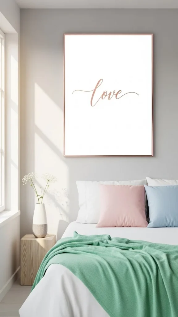 Typography art makes a clear statement with very little effort. Choose a script font that feels gentle and refined. Stick to a light color palette—rose-gold, blush, or beige are great options. This print works beautifully above nightstands, consoles, or gallery walls. Print it at home for an inexpensive DIY project. Pair it with florals, line art, or small frames for balance. Typography prints keep the message simple and charming.
