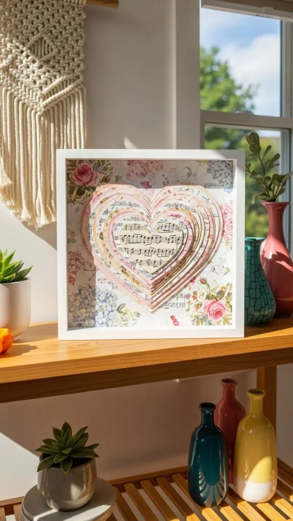 A mixed-media collage lets you add personality to your Valentine décor. Use old book pages, floral scraps, or leftover craft paper to create layers. Cut them into small shapes and arrange them into a heart. A shadow box adds depth and keeps the collage protected. This is a great project for repurposing leftover materials. The final piece feels personal, textured, and stylish. Hang it solo or place it beside soft floral prints for added charm.