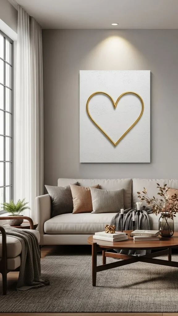 Metallic art brings a refined shine to Valentine décor. A gold heart outline gives a sculptural effect without feeling heavy. Look for pieces mounted on linen or canvas for texture. You can DIY this style using thin metal rods or gold-painted wire shaped into a heart. Attach it to canvas using small staples or glue. The mix of shine and texture adds dimension to your wall. This piece blends easily with neutral palettes and modern layouts.
