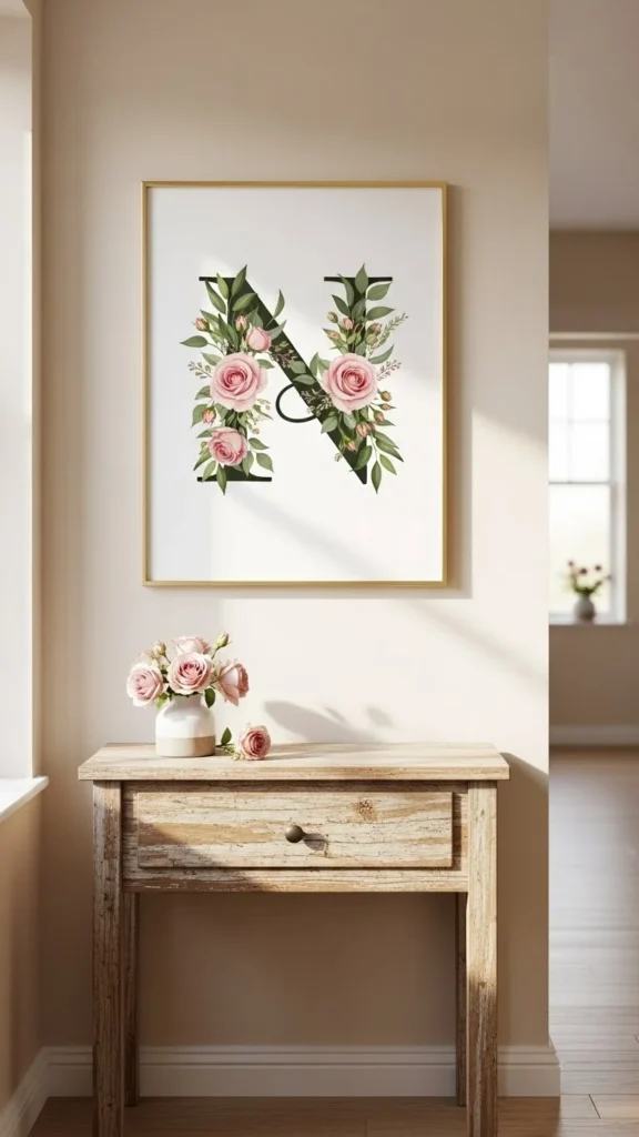 A floral monogram feels personal and stylish. Choose your initial or a shared one if decorating for a couple. Soft florals add charm without feeling too bold. You can create your own using digital design tools or purchase prints online. Match the frame color with nearby furniture for cohesion. Hang it near a console for a refined entryway moment. The monogram approach blends personalization with soft Valentine character beautifully.