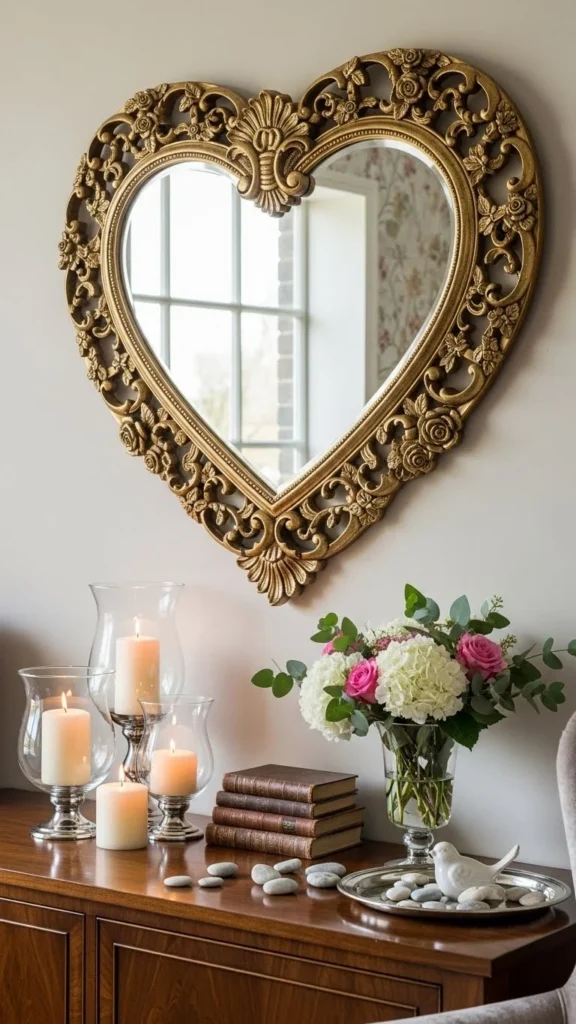 Mirrors make rooms feel brighter and add decorative charm. A heart-shaped mirror offers a chic Valentine twist. Choose gold, brass, or white frames depending on your palette. Hang it above a console, fireplace, or dresser. Add candles or florals below for balance. You can find affordable versions at home décor stores or thrift shops. Mirrors also help visually open smaller spaces, making them feel lighter and more inviting.